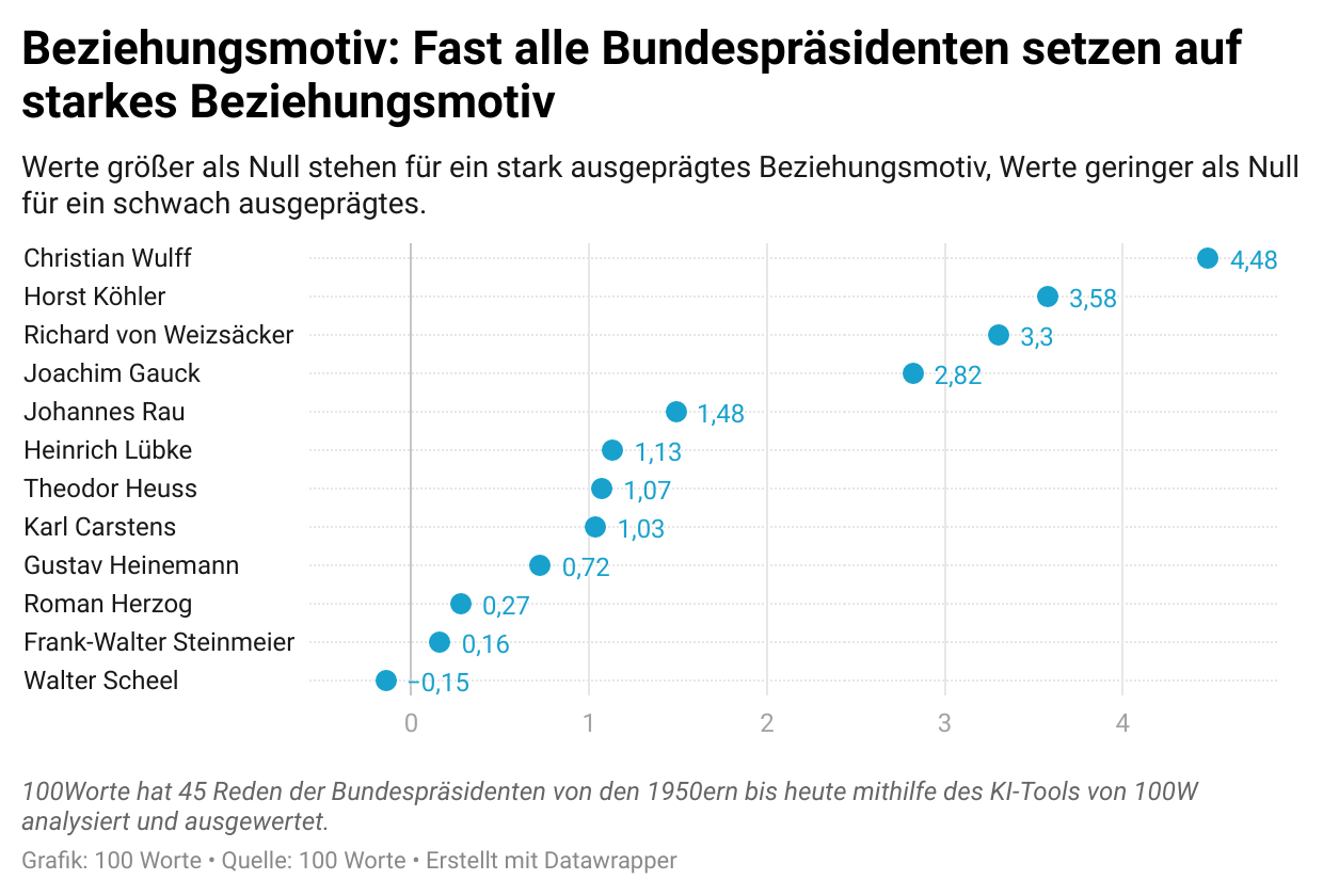 Auf das Beziehungsmotiv setzen elf der zwölf Staatsoberhäupter. Dieses steht für die Bemühung um zwischenmenschliche Beziehungen, neue Kontakte und ein gutes Netzwerk und wird durch Worte wie “treu”, “unterstützen” oder “gemeinschaftlich” charakterisiert. Christian Wulff macht davon am stärksten Gebrauch, schwach ausgeprägt ist das Beziehungsmotiv hingegen bei Walter Scheel.