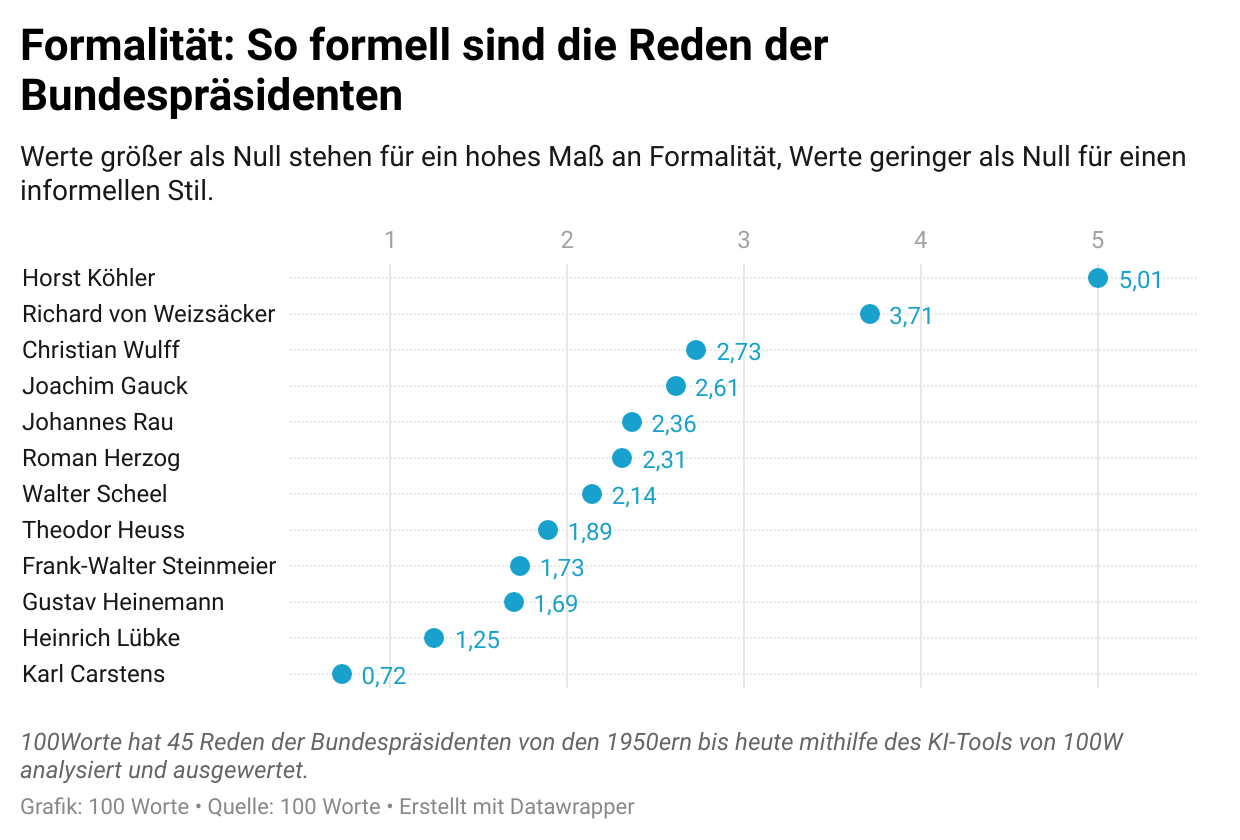 Der Bundespräsident gilt als Vertreter der deutschen Bevölkerung und seine Äußerungen können auch Politiker:innen und die Gesellschaft beeinflussen. Das Bewusstsein über die Verantwortung ihrer Äußerungen reflektiert die Formalität ihrer Wortwahl, illustriert in der folgenden Grafik. Horst Köhler, Deutschlands Präsident von 2004 bis 2010, nutzte den formellsten Stil, während Karl Carstens (Präsident von 1979 bis 1984) den geringsten Grad an Formalität aufweist.