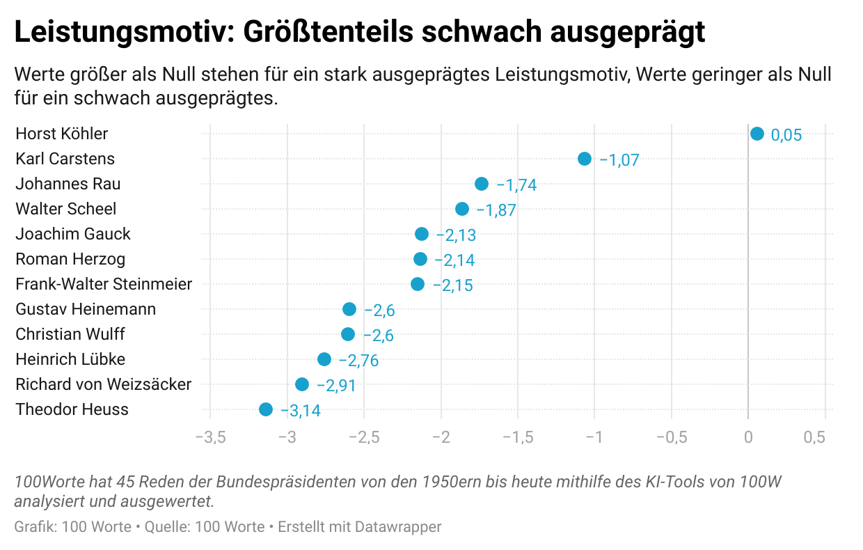 Das Leistungsmotiv, welches Selbstsicherheit und Ambition kommuniziert, ist lediglich bei Horst Köhler stark ausgeprägt. Theodor Heuss befindet sich mit einem schwach ausgeprägten Leistungsmotiv am entgegengesetzten Ende des Spektrums.