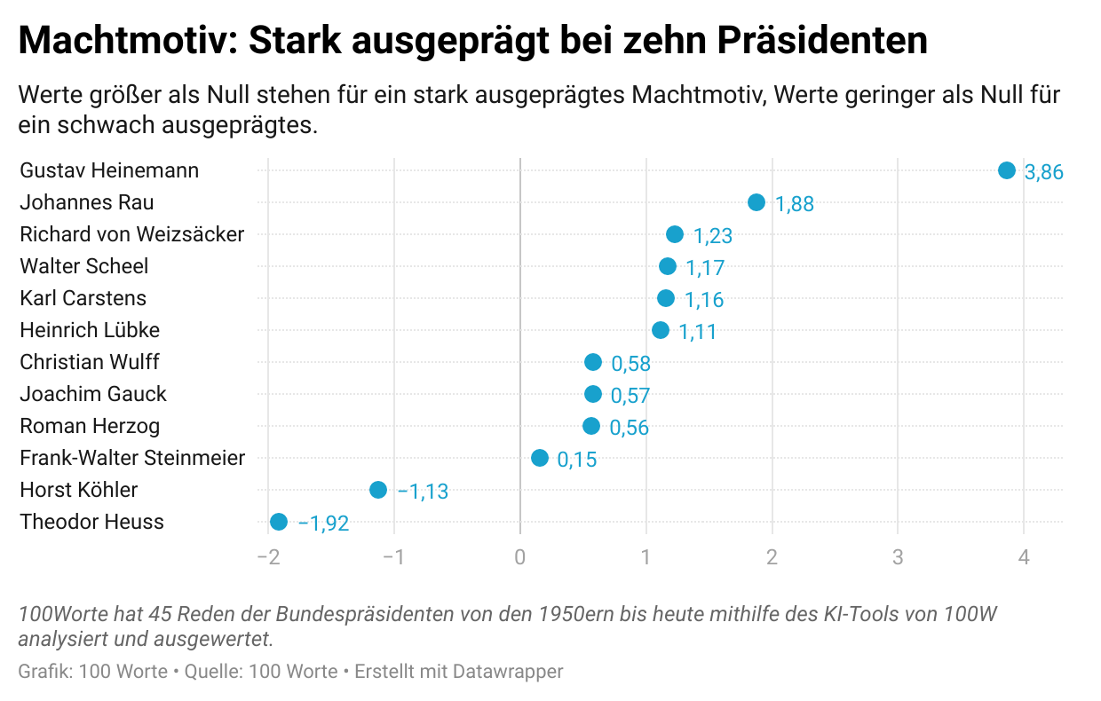 Auf das Machtmotiv, das der Einflussnahme dient, setzt der Großteil der deutschen Bundespräsidenten. Bei zwei Präsidenten ist dieses jedoch gering ausgeprägt: Theodor Heuss und Horst Köhler wählen weniger dominante Worte. Gustav Heinemann hingegen ist der Präsident, in dessen Reden das Machtmotiv mit Abstand am stärksten vertreten ist.