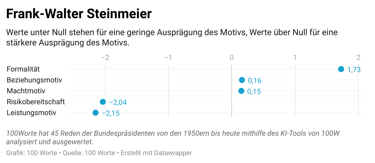 Der Mitte Februar 2022 wiedergewählte Bundespräsident, Frank-Walter Steinmeier, kommuniziert wie der Durchschnitt seiner ehemaligen Amtskollegen: Risikovermeidend, aber im Schnitt etwas gewagter (risikofreudiger) als seine Vorgänger. Seine Kommunikation ist von Macht- sowie Beziehungsmotiven geprägt, welche etwas schwächer ausfallen als in den übrigen analysierten Ansprachen. Zudem wählt er weniger formelle Worte als der Durchschnitt. Das gering ausgeprägte Leistungsmotiv entspricht in etwa dem Durchschnitt der untersuchten Reden.